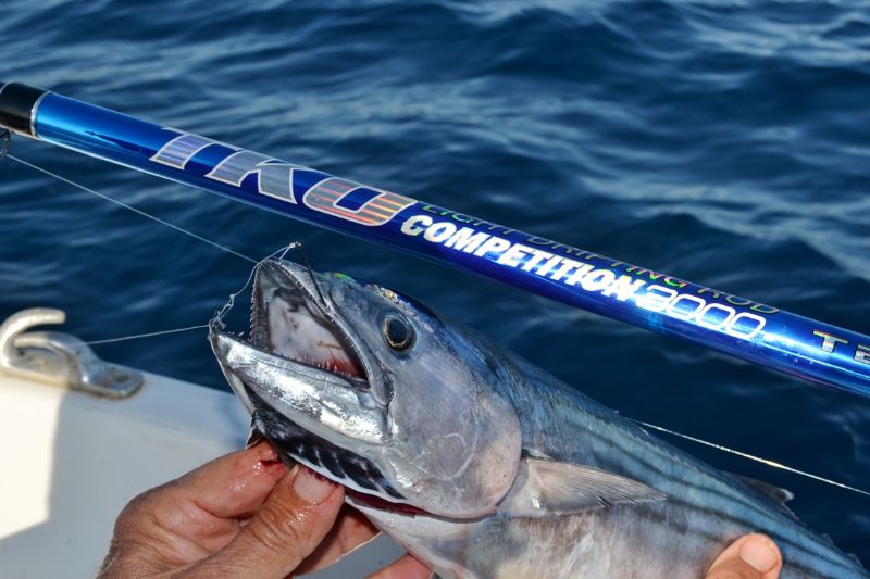 A tale proposito, consiglio due tipi di canne distribuite dalla Tecnofish, la TKO LIGHT DRIFTING ROD COMPETITION 3000, di mt 3,5, usata nella battuta di pesca a lightdrifting alle palamite e la SUPERTAKO’ 4150, teleregolabile di mt 4,00 usate entrambe nella ripresa VIDEO, con la tecnica del bolentino con barca ancorata. Queste canne, dotate di anelli di qualità della Statunitense Pacific Bay, con pietra in “duraloy” lucidata, offrono un’adeguata risposta, sia nell’utilizzo del monofilo che per l’uso continuato ed aggravato del multifibra Dyneema o Spectra nei vari libbraggi. I 12 passanti presenti, su questo modello di punta, distribuiti nel numero di 6 nei 4 pezzi disponibili, più altri 6 per ogni vettino utilizzato, forniscono una certa fluidità nello scorrimento della lenza. Tutti gli anelli sono ben distribuiti e contribuiscono in modo equilibrato ad armonizzare le flessioni più energiche e stressanti in pressing sull’intera canna. Questo lo si evince, in modo particolare, quando capita di “stanare” dal fondo una preda ambita come un dentice di taglia importante. Praticamente, “forzare” quando occorre e “concedere” al momento richiesto. Sia la TKO LIGHT DRIFTING ROD COMPETITION 3000 che la SUPERTAKO’ 4150, hanno dato nelle prove pratiche, dei risultati eccellenti.